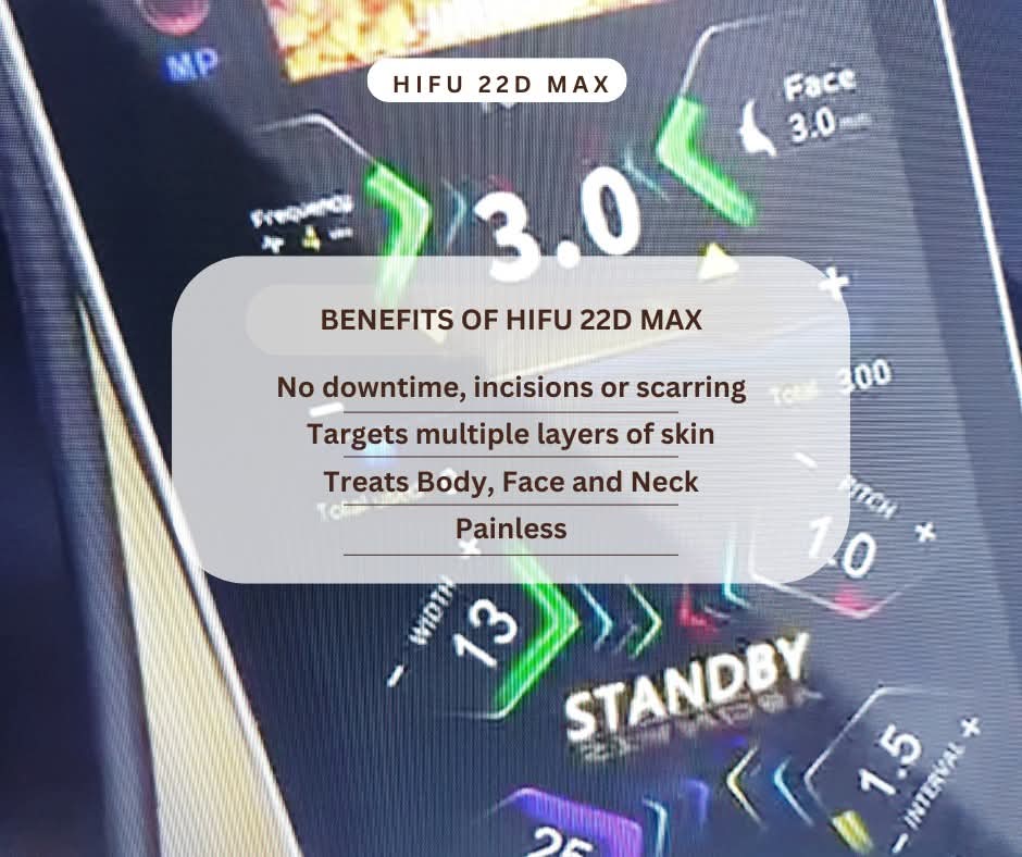 HIFU (High-Intensity Focused Ultrasound) is a non-invasive, skin-friendly treatment designed to reduce wrinkles, lift and tighten the skin, and contour the body—with results lasting up to two years. The advanced 22D MAX HIFU system delivers faster, more effective outcomes by targeting deep layers of skin and fat without the need for surgery, downtime or scarring.Â